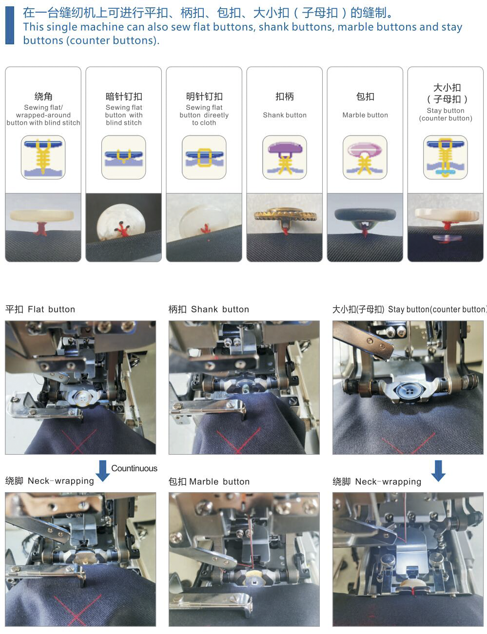 This single machine can also sew flat buttons,shank buttons,marble buttons and staybuttons(counter buttons).
